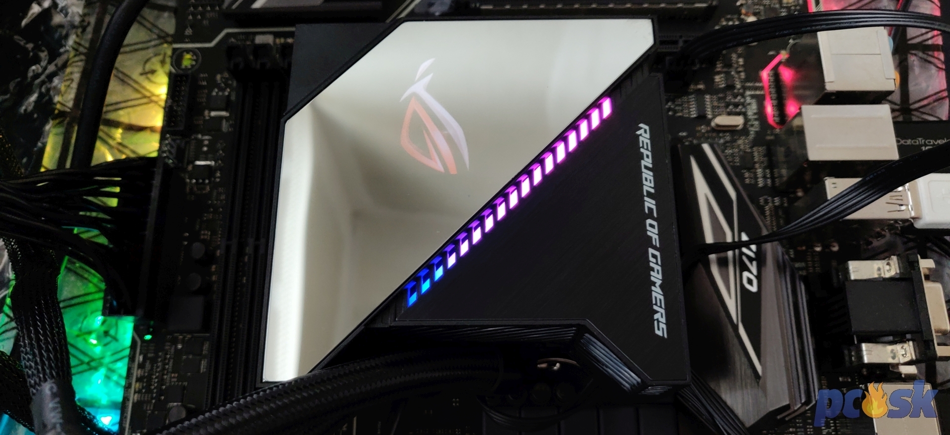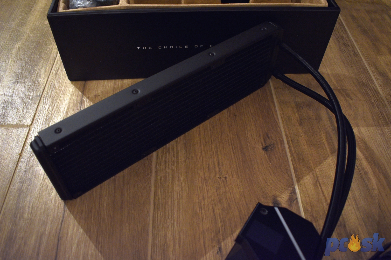 Dizajn krytu pôsobí na prvý pohľad agresívne, no od ROG produktu sa to dalo čakať. Vo vnútri bloku sa nachádza malý ventilátor, ktorý má pomocť s chladením okolitých komponentov. Ventilátor sa točí "závratných" 4800RPM. Zbytok chladiča je viac menej „normálny“ – máme tu trubice potiahnuté nylonom, ktoré im dodávajú potrebnú pevnosť a samozrejme po dizajnovej stránke sú omnoho krajšie, ako keby Asus ponechal na chladiči obyčajné gumové hadice. Radiátor je radiátor (tu veľa dizajnových zmien nevymyslíte) a zaujímavým ho robia práve čierne Noctua PPC Industrial ventilátory.