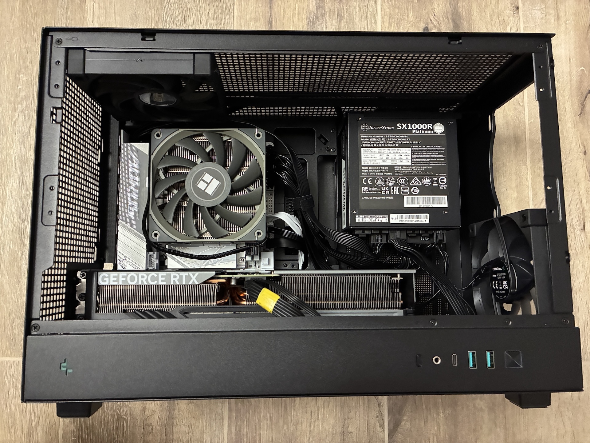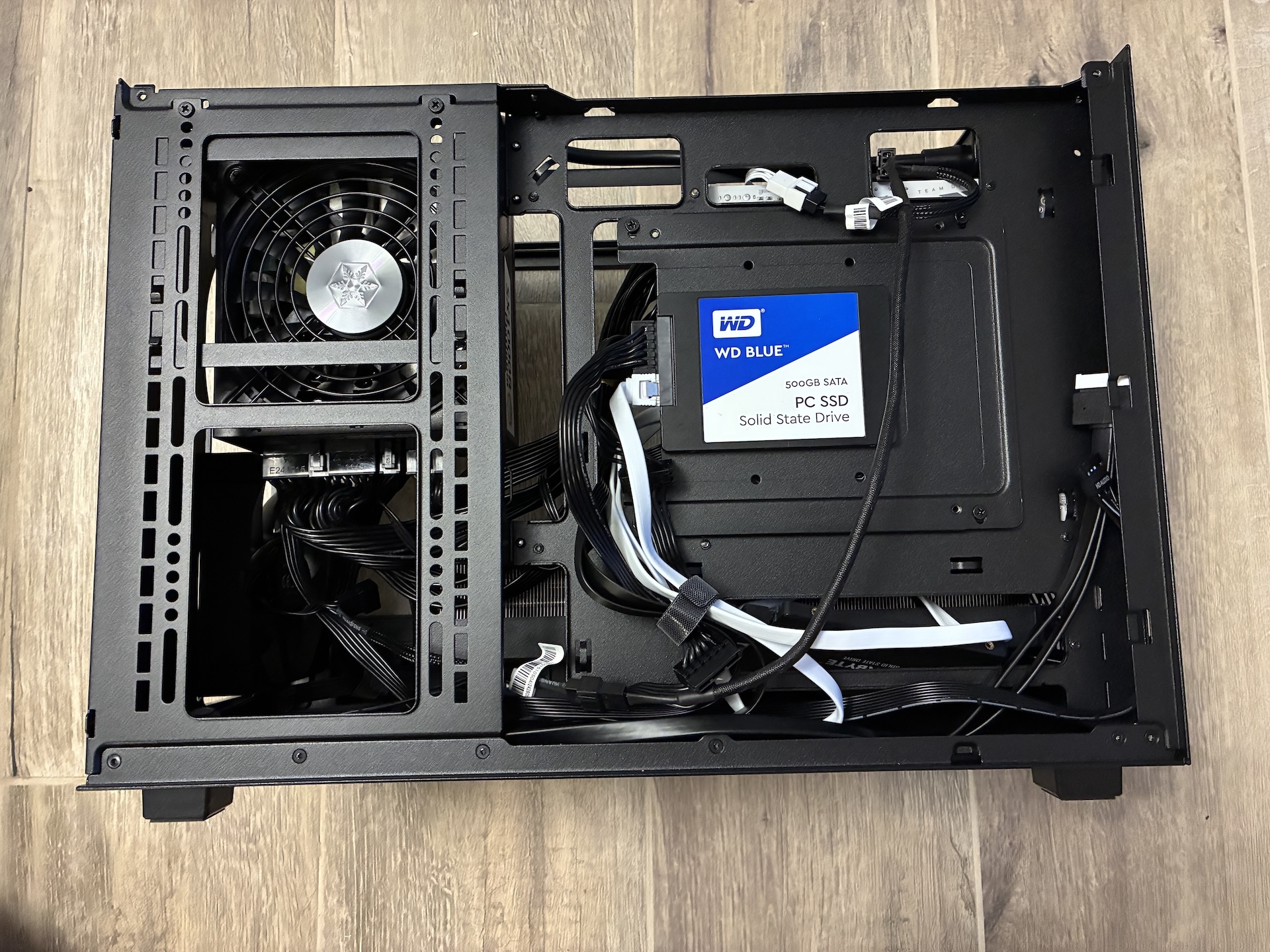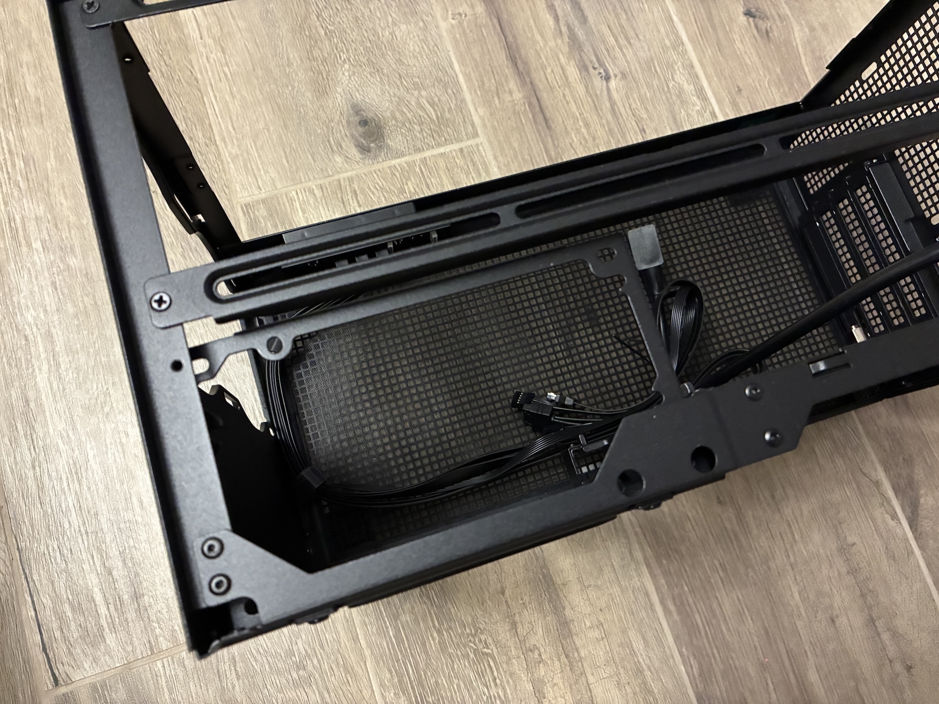 Grafická karta Gigabyte RTX 4070Ti Super sa sem zmestila bez väčších problémov - ak by bola karta dlhšia, pri ATX zdroji by ste už narazili na problém s ohýbaním káblov. Celkovo má však karta dostatok miesta na nasávanie čerstvého vzduchu.