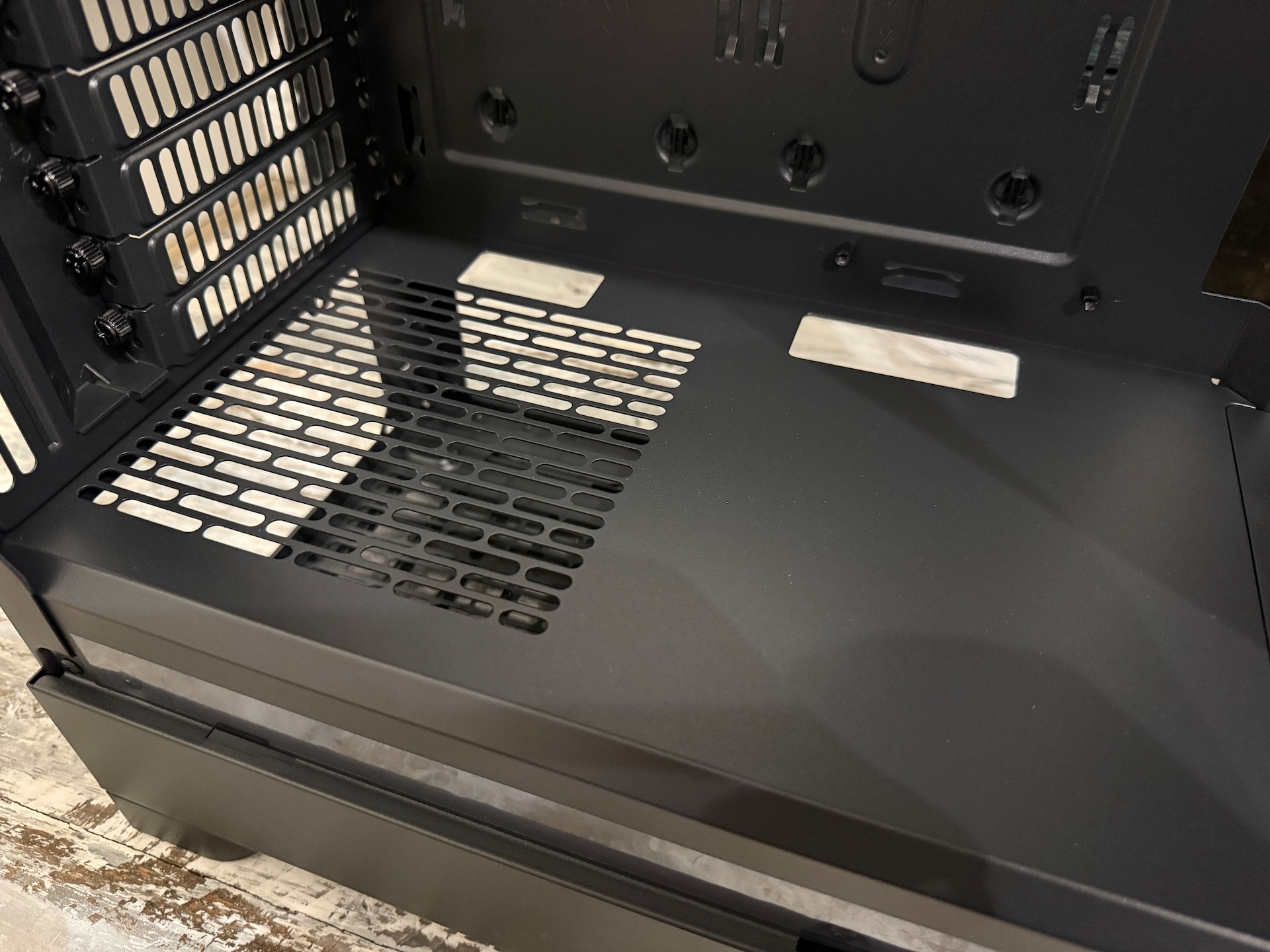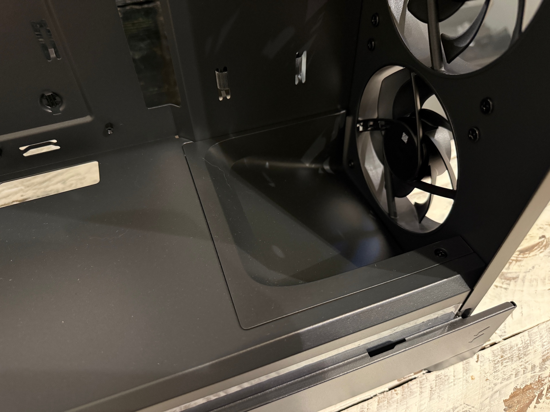 Po nahliadnutí do vnútra skrinky, si všimnete dve veci, ktoré vám hneď napovedia, že sa skrinka zameriava na airflow. Prvou z nich sú zakrytované boky okolo predných ventilátorov – všetok vzduch od ventilátorov je priamo smerovaný do skrinky a k žiadnej strate prúdenia vzduchu neprichádza.
