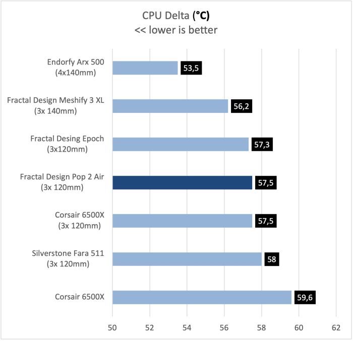 Prvé čo musím povedať je, že sú ventilátory v Pop 2 Air naozaj tiché a pri 700RPM ich nebudete ani počuť. Celkové výsledky sú na veľmi dobre úrovni a podobné tým, ktoré sme videli u skrinky Epoch.