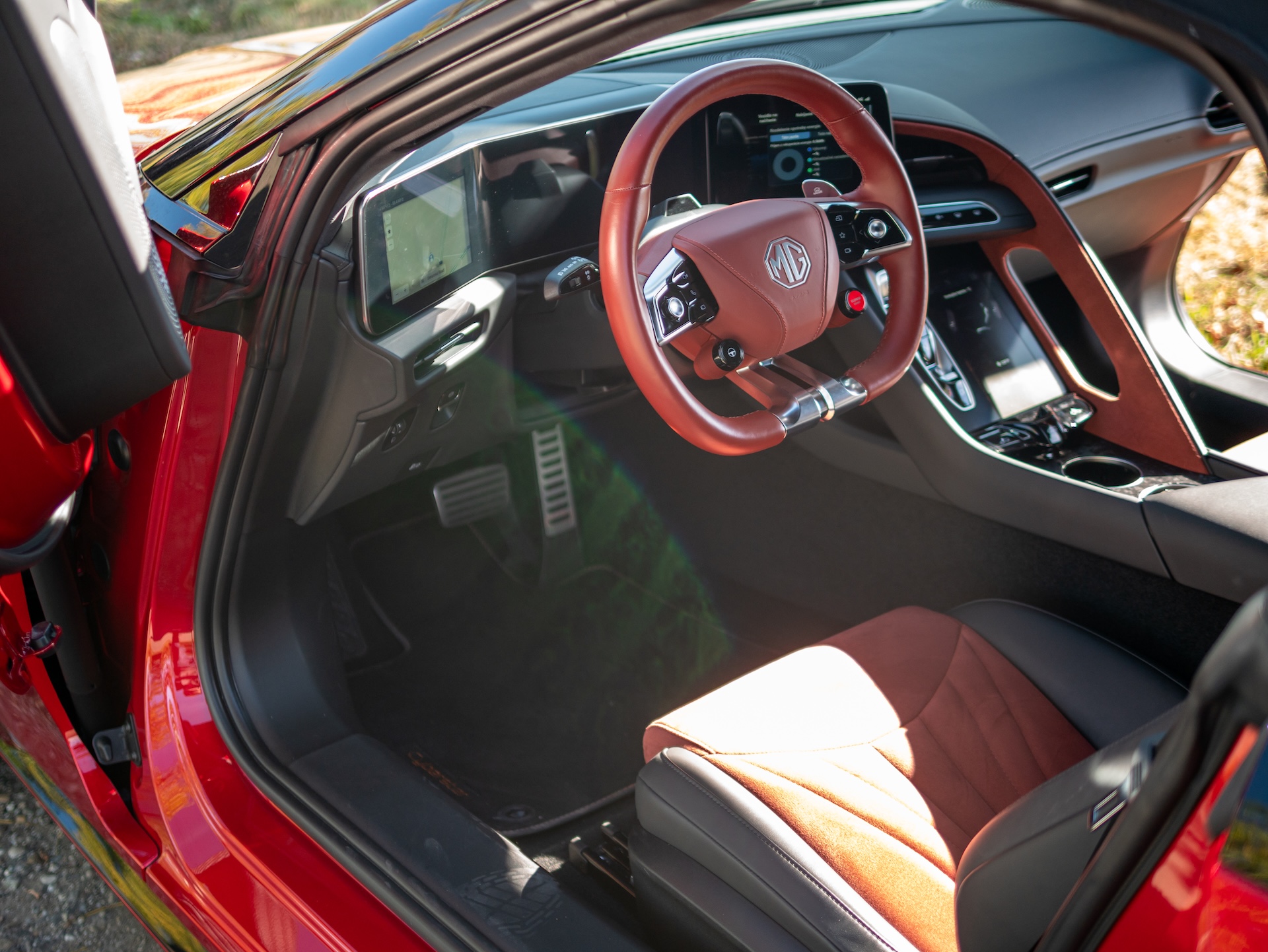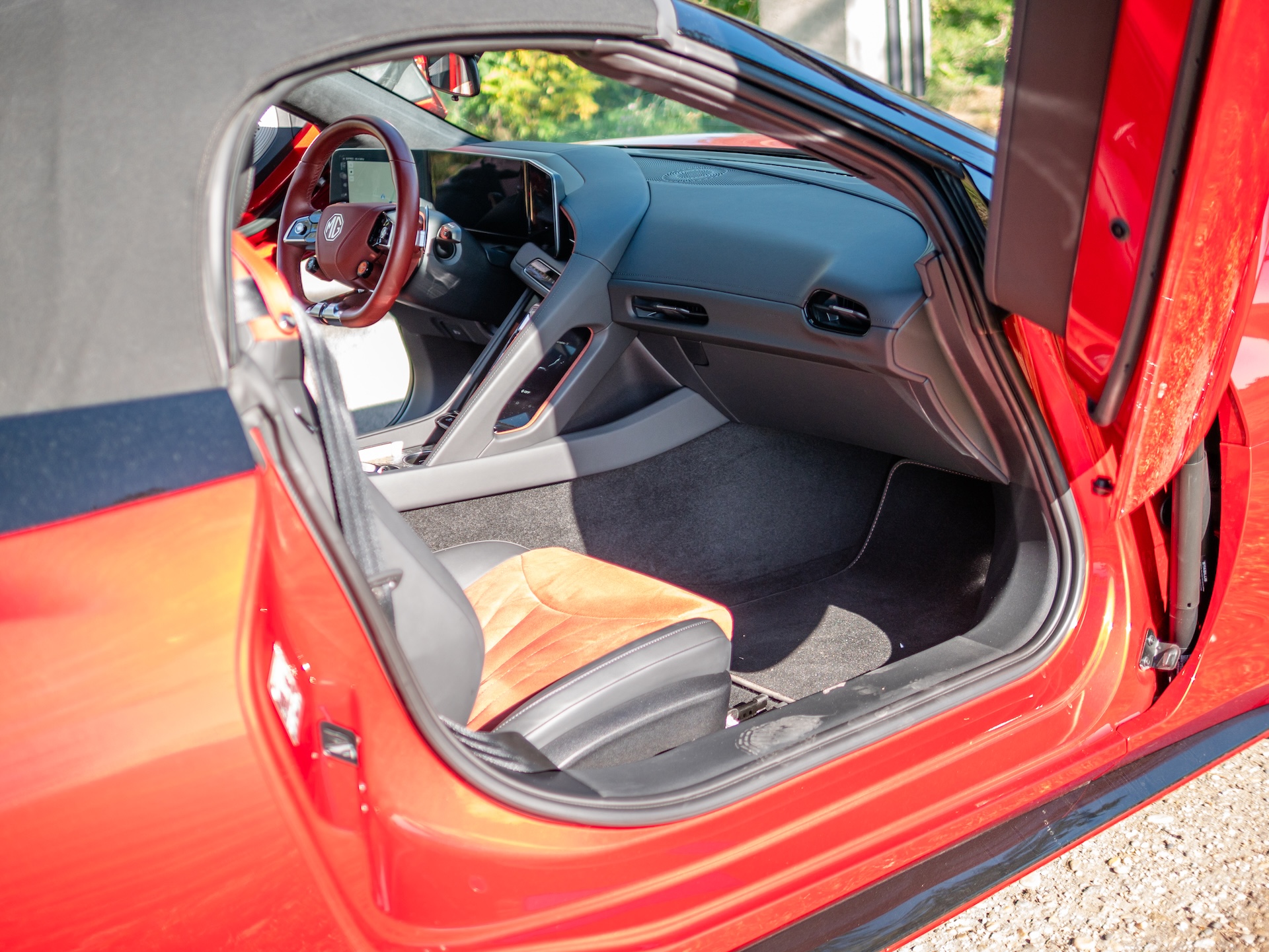 Nejak tak automaticky som očakával, že ak Cyberster prepnem do super sport módu, podvozok bude až neznesiteľne tvrdí, ale nie je tomu tak – MG neponúka u tohto modelu adaptívny podvozok. Super sport mód vám odomkne launch control, zvýši citlivosť plynového pedálu, volant je ostrejší a AWD systém precíznejšie pracuje s distribúciou výkonu na jednotlivé kolesá...napriek tomu, je náklon v zákrutách pri vyšších rýchlostiach väčší, ako by mohol byť.