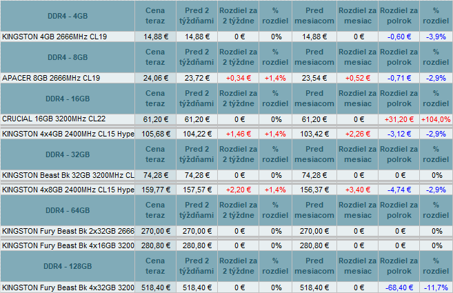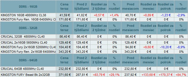 Pamäte DDR4 zdraželi mierne do +1,4% a DDR5 až do +29,1%.