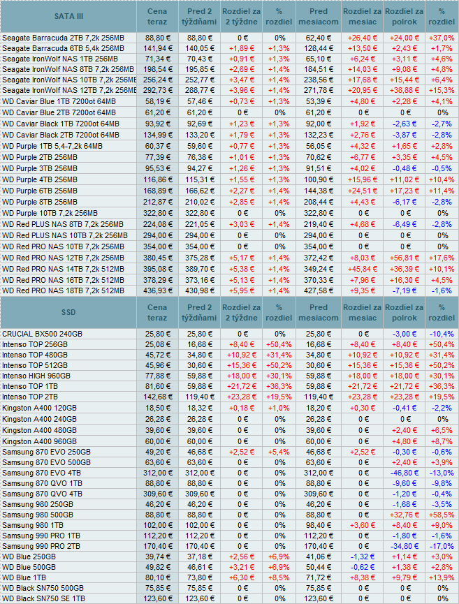 Platňové disky menili ceny do +1,4%. U SSD boli ešte výraznejšie až do vysokých +50,4%. Y preh+ladu vzpadol SSD SanDisk PLUS 240GB.