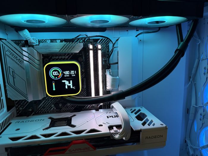 V takomto zložení, sa dá vyhrať s RGB podsvietením - na fotke majú zapnuté osvetlenie len predné ventilátory a CPU blok (ventilátory na AiO chladiči ostali vypnuté, rovnako ako samotný LCD displej na chladiči)