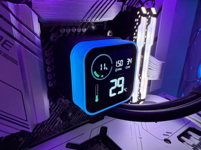 Zapnutý LCD displej na chladiči Deepcool LQ360 pôsoní naozaj moderne a dokáže zobraziť viacero údajov o CPU - primárne teplotu a vyťaženie CPU