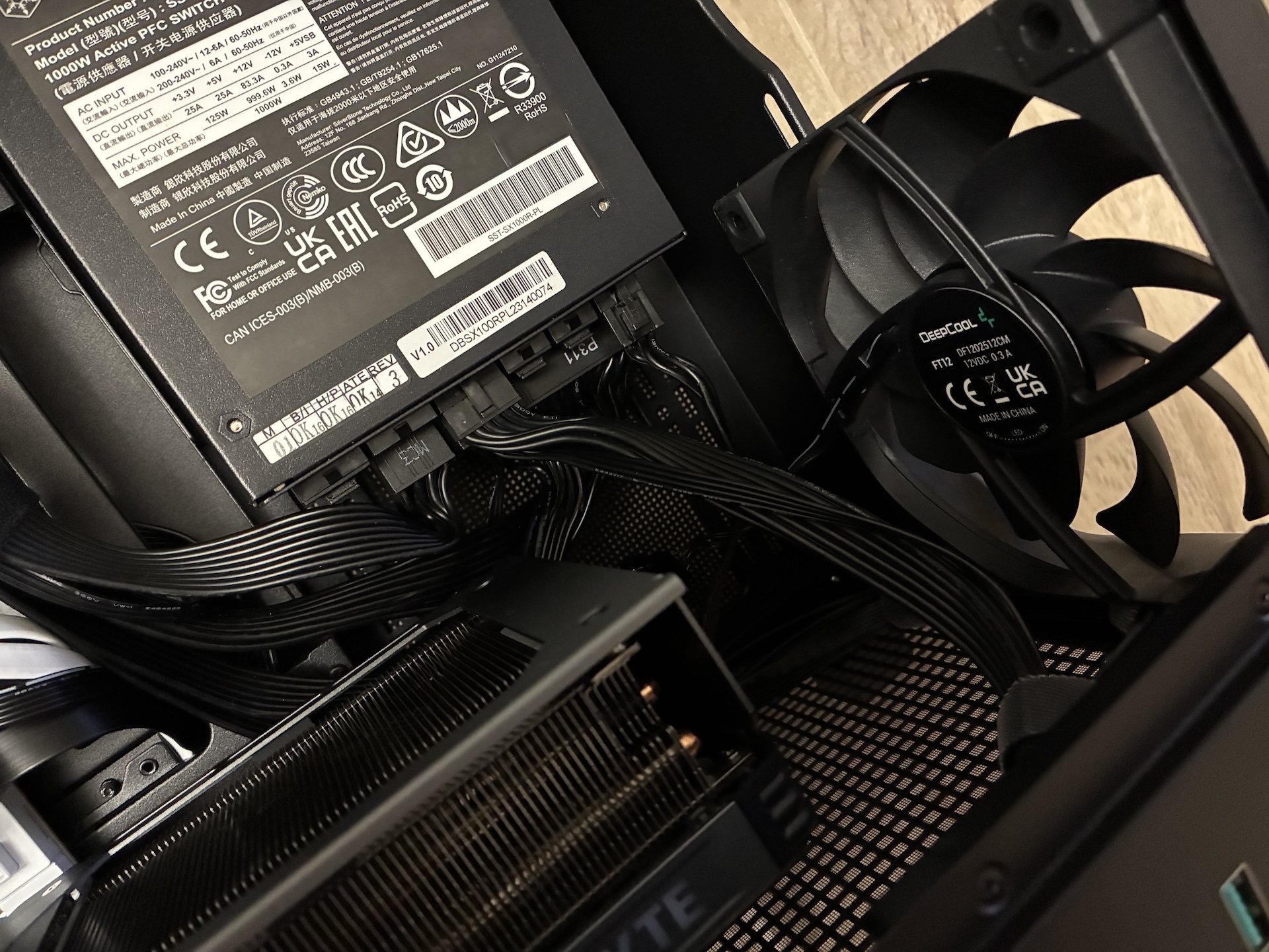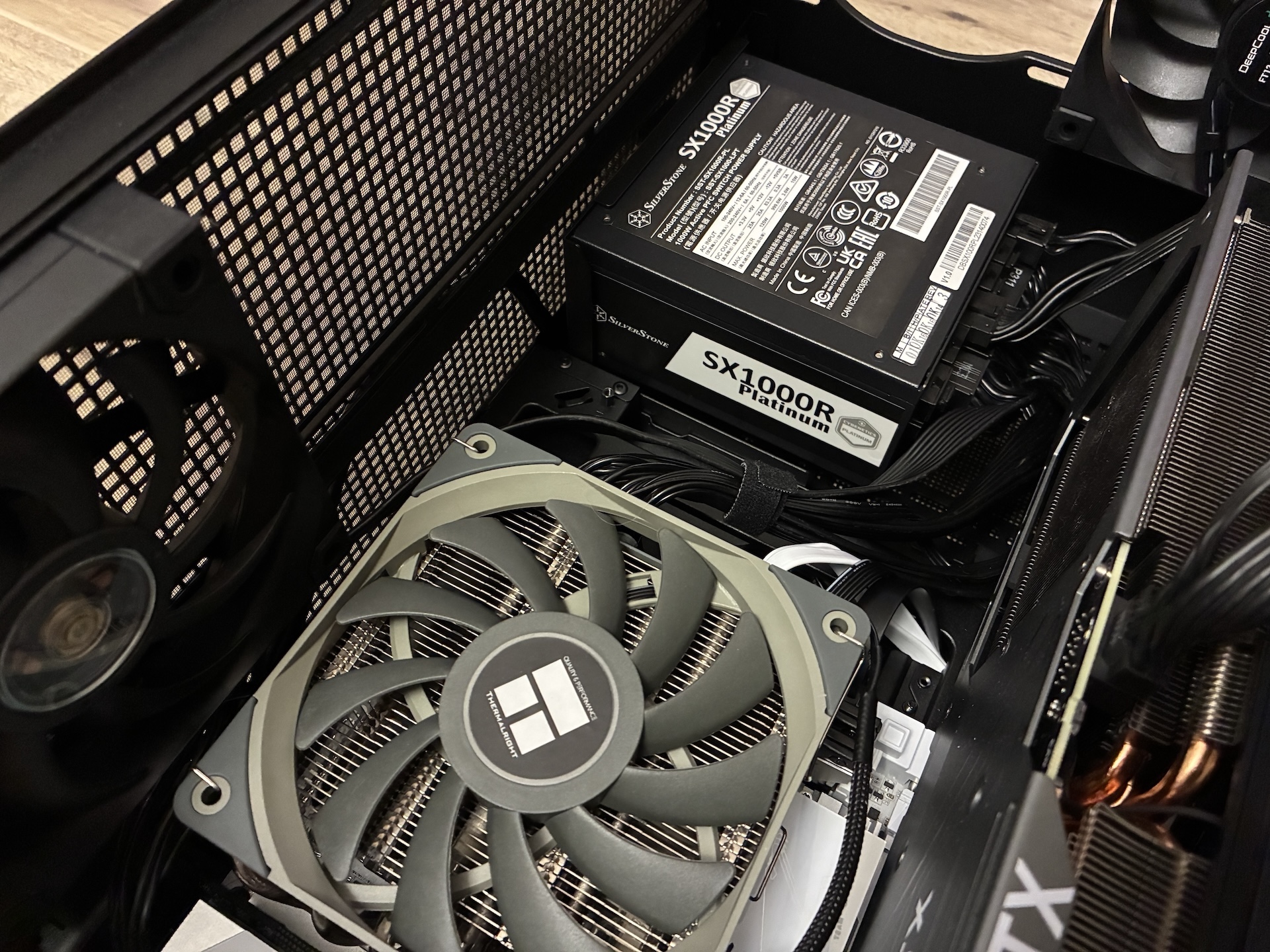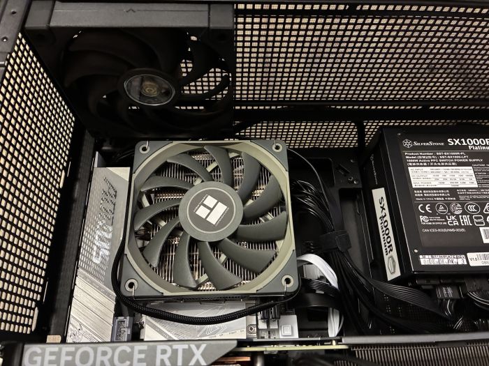 Grafická karta Gigabyte RTX 4070Ti Super sa sem zmestila bez väčších problémov - ak by bola karta dlhšia, pri ATX zdroji by ste už narazili na problém s ohýbaním káblov. Celkovo má však karta dostatok miesta na nasávanie čerstvého vzduchu.
