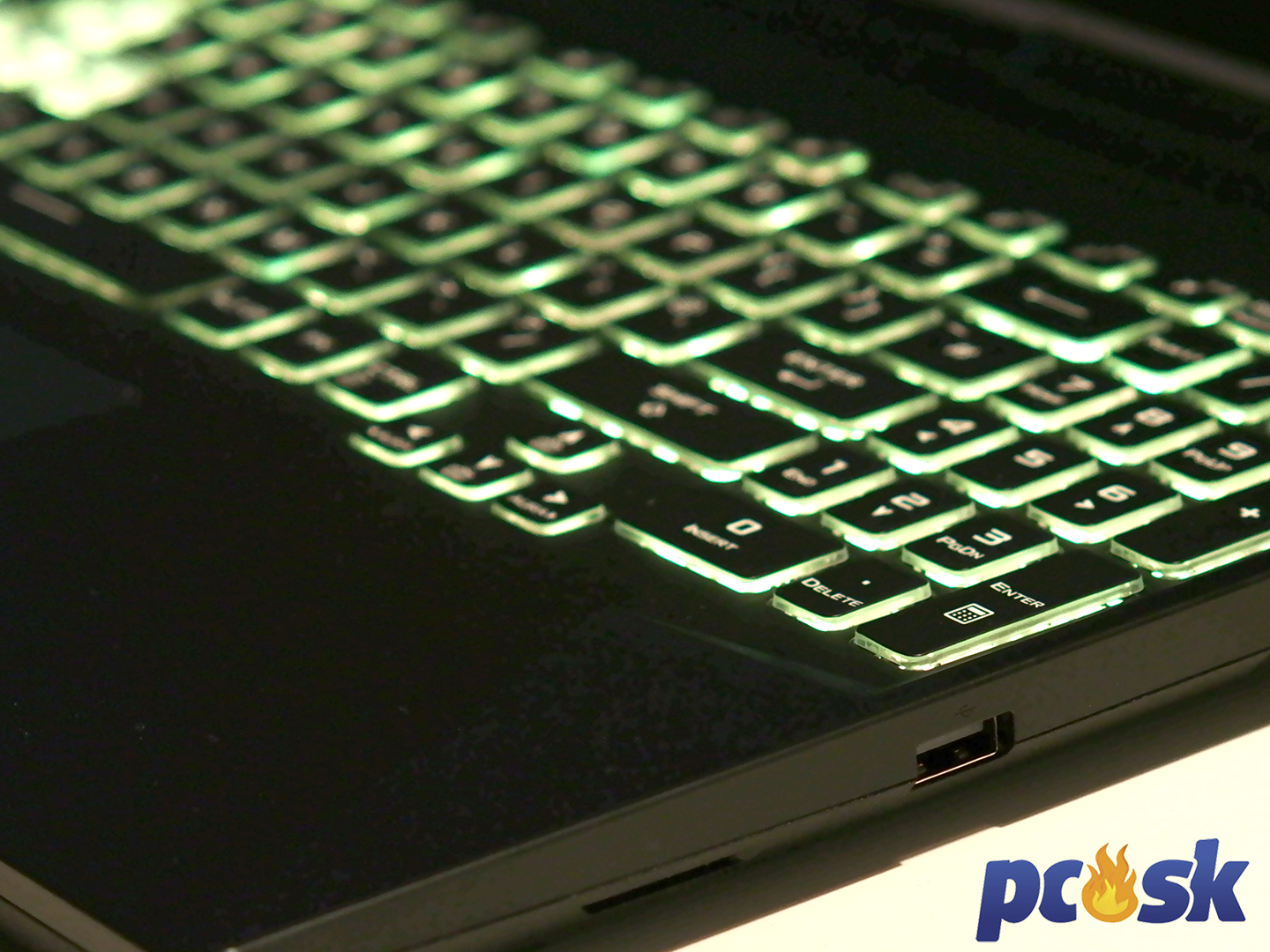 Klávesnica notebooku je podsvietená a to dokonca RGB. Jedná sa však iba o jednu spoločnú zónu pre všetky klávesy. Podsvietenie jednotlivých klávesov je tak vyhradené drahším modelom. Potešia však vizuálne oddelené WASD klávesy a prítomnosť numerického bloku. Prítomné sú aj klávesy šípok, tie sú však o niečo menšie oproti ostatným klávesom a hranie na nich nie je úplne ideálne.