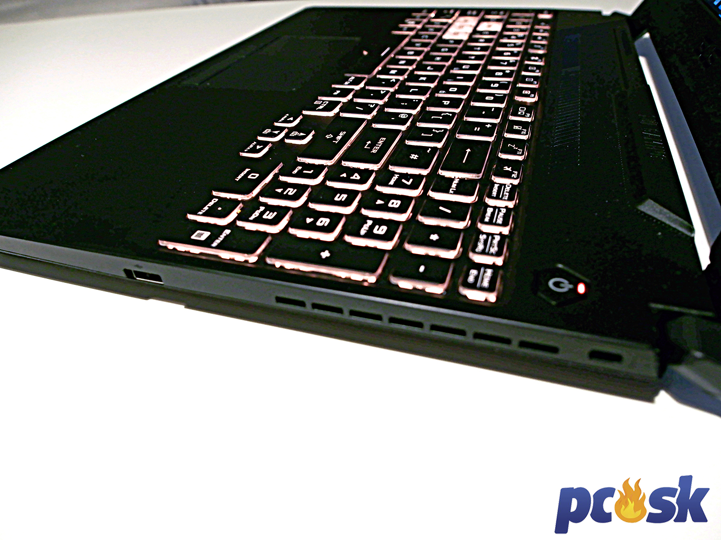Klávesnica notebooku je podsvietená a to dokonca RGB. Jedná sa však iba o jednu spoločnú zónu pre všetky klávesy. Podsvietenie jednotlivých klávesov je tak vyhradené drahším modelom. Potešia však vizuálne oddelené WASD klávesy a prítomnosť numerického bloku. Prítomné sú aj klávesy šípok, tie sú však o niečo menšie oproti ostatným klávesom a hranie na nich nie je úplne ideálne.