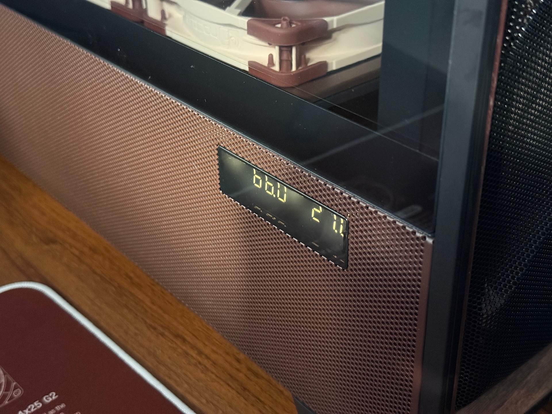Späť však k exteriéru – Noctua nijak nemenila samotný dizajn Flux Pro. Nájdeme tu malý displej na zobrazenie teploty CPU a GPU v spodnej časti, rovnaký predný panel, či I/O vstupy na vrchu skrinky (2x klasické USB, USB C, tlačidlo pre reset, zapnutie a tlačidlo na prepínanie teploty displeja).