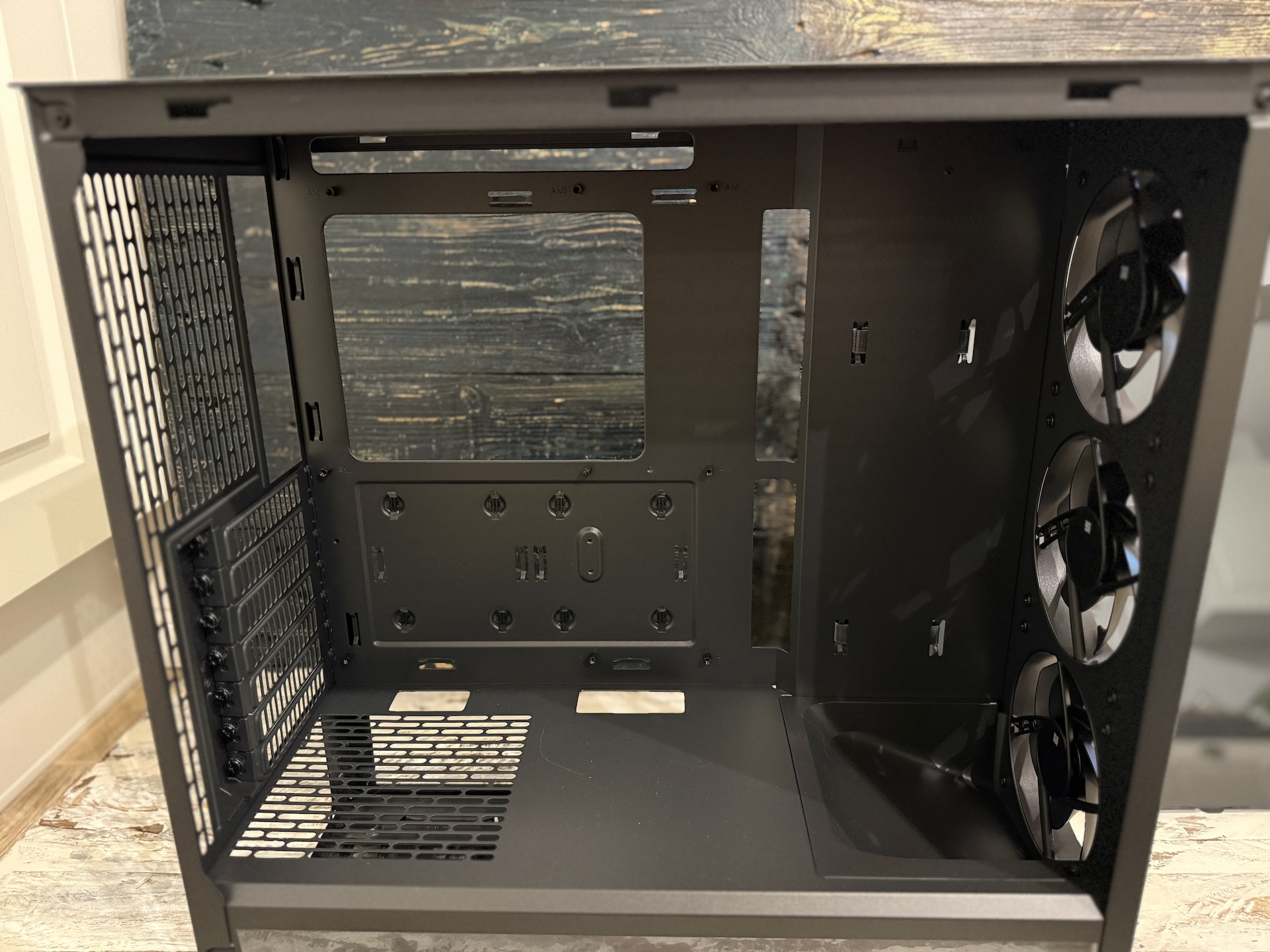 Po nahliadnutí do vnútra skrinky, si všimnete dve veci, ktoré vám hneď napovedia, že sa skrinka zameriava na airflow. Prvou z nich sú zakrytované boky okolo predných ventilátorov – všetok vzduch od ventilátorov je priamo smerovaný do skrinky a k žiadnej strate prúdenia vzduchu neprichádza.