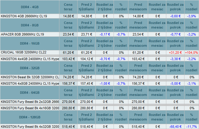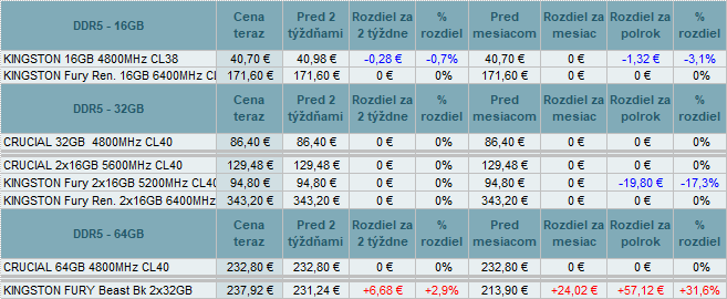 Pamäte DDR4 zlacneli do -0,7% a DR5 menili ceny od 2,9% do -0,7%.