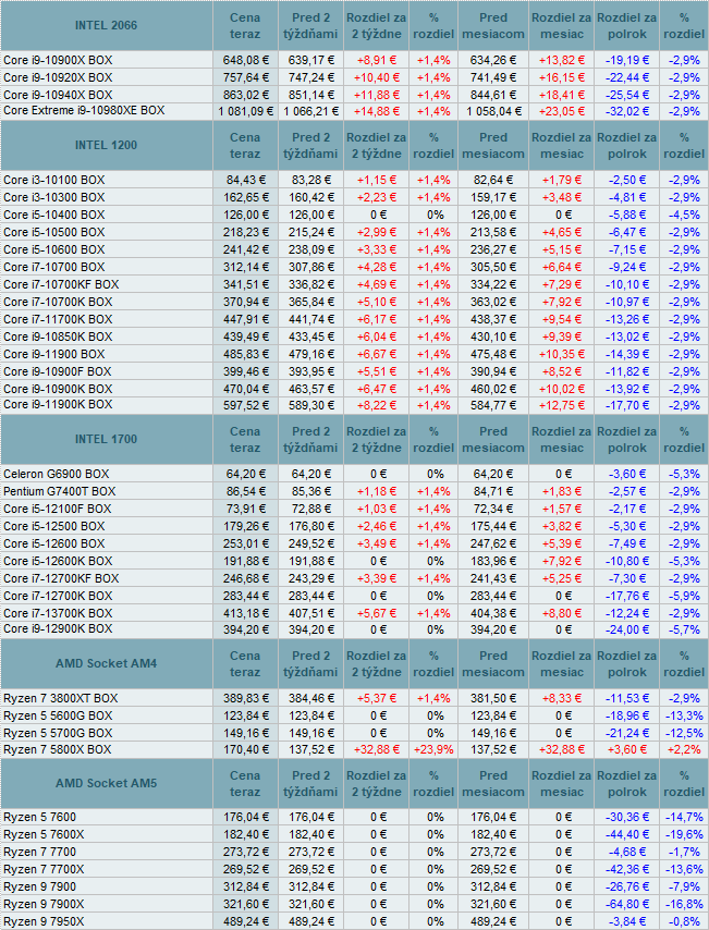 Ceny procesorov INTEL stúpli do +1,4%, ale u AMD to bolo až do +23,9%.