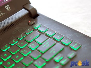 Klávesnica má nízky zdvih klávesov, ako je to tradične pri notebookoch. Potešujúce je však, že ROG zachoval medzery medzi klávesami, vďaka čomu sa jednotlivé klávesy ľahko rozlišujú. Tie sú naviac podsvietené RGB s regulovateľnou intenzitou. Nad rámec štandardných klávesov pridal výrobca dodatočné klávesy na ovládanie prehrávania, ktoré sa nachádzajú vpravo, a dedikované klávesy na ovládanie hlasitosti, mikrofónu, chladenia a vstup do aplikácie Armory Crate. Škoda, že popri tom nezostal priestor na plnohodnotné šípky ale iba na ich menšiu verziu.
