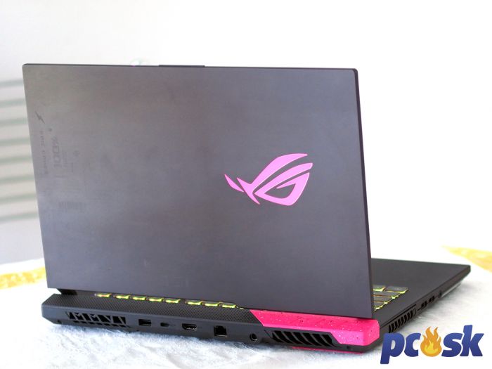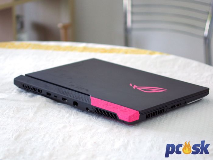 Dizajn notebooku zaujme výrazným logom ROG a farebne odlíšeným rohom notebooku. Oba tieto prvky sú skutočne ružové a nejedná sa o farebné skreslenie fotoaparátu. Ružový variant má šedé telo a rôzne dizajnové popisy. Kto sa nevie preniesť cez tieto extravagantné prvky a namiesto nápisov preferuje čistejší dizajn, tomu ROG ponúka ďalšie dva varianty. Materiál tela je kombináciou pevného plastu a hliníkového veka displeja.