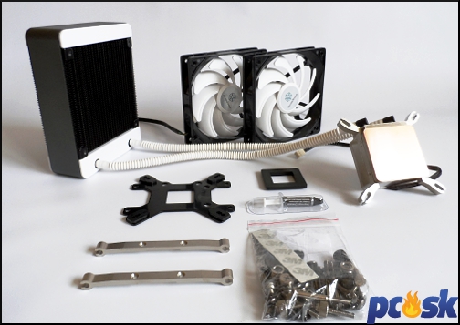 Súčasťou balenia sú dva 120mm ventilátory s PWM reguláciou, vrecko so skrutkami, montážna sada, tuba teplovodivej pasty a, samozrejme, manuál.